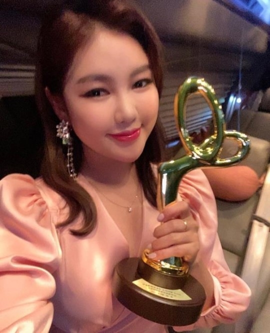 공개된 사진 속 송가인은 트로피를 들고 포즈를 취하였다.