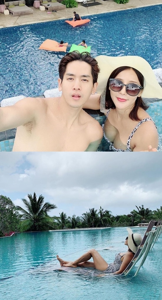공유된 사진에는 수영장에서 다정히 셀카를 찍고 있는 부부가 있다.