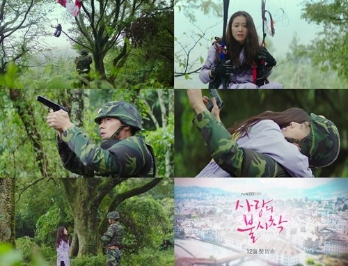 티저 영상은 인적이 드문 산속 패러글라이딩 복장을 한 손예진(윤세리 역)이 나무 위에 걸려 “여기요..!”라며 도움을 구하는 장면으로 시작, 이를 발견하고 경계하며 조심스레 다가가는 군인 현빈(리정혁 역)의 모습이 드러나 시선을 사로잡았다.