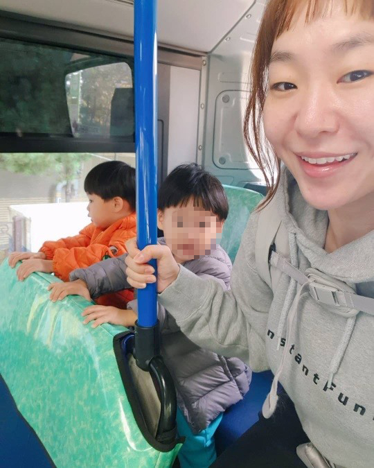 공개된 사진 속 정주리를 세 아들과 함께 버스를 타고 이동중인 모습이다.