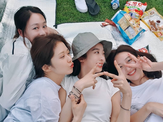 공유된 사진에는 장나라, 표예진, 이진희와 함께 잔디밭에 돗자리를 깔고 누워 있다.