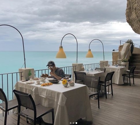 공개된 사진 속 김풍은 푸른바다가 펼쳐진 레스토랑을 찾은 모습이다.