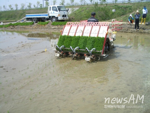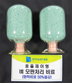 개발한 비료는 벼 밑거름(기비)과 가지거름(분얼비) 이 포함된 용출제어형 비료다. 이 비료는 모내기 직전에 우리가 살충제 입제를 기계이앙 묘판에 뿌리고 이앙하는 것과 똑같은 방법으로 사용하면 분얼비까지 커버되며 본답 10a당 기준으로 소요되는 총묘판상자 사용량은 9kg이다. 이 비료를 이용할 경우 비료량과 비료살포 노동력을 절반으로 줄일수 있는 효과가 인정됐고 이 비료와 비료살포기는 산업체에 기술이전 돼 금년 10월 이후 판매 될 예정이다. |