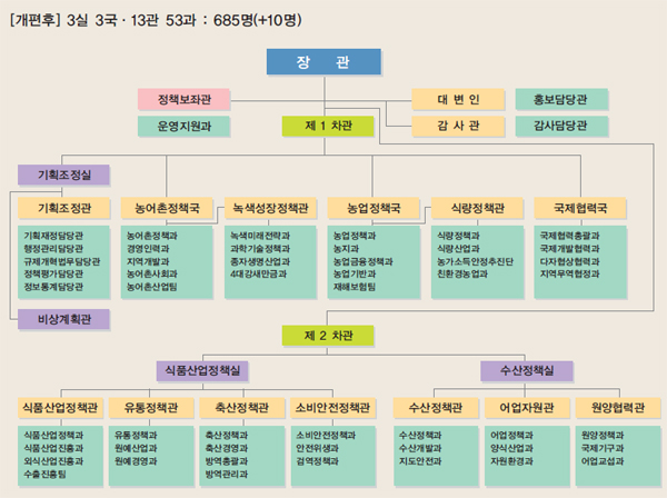 농식품부는 농축산물의 물가불안과 가축질병, 기후변화, 자유무역협정(FTA) 확대 등에 효과적으로 대응하기 위한 일환으로 대대적인 조직개편을 단행했다고 밝혔다. 개편안에 따르면 농식품 물가안정과 유통효율화 등의 업무를 전담하는 ‘유통정책관’이 신설된다. 유통정책관은 ‘농업연수원’과 ‘수산인력개발원’ 통합에 따른 여유 고위공무원단 직위를 활용해 신설키로 했다. 공통부서를 통합하고 사업부서를 신설했다. 동물방역과를 ‘방역총괄과’와 ‘방역관리과’로 개편해 구제역과 조류인플루엔자(AI) 등에 효율적으로 대응한다는 계획이다. 또 FTA 등 시장개방 대응 및 수출확대 정책을 전담 할 ‘수출진흥팀’과 재해대책 및 보험업무를 확대․전담 추진 할 ‘재해보험팀’, 농어촌 지역개발 및 산업진흥을 담당 할 ‘농어촌산업팀’을 신설한다, √ 수출진흥팀, 재해보험팀, 농어촌산업팀 신설 이와 함께 ‘농촌정책국’을 ‘농어촌정책국’으로 개편해 현 농업정책국의 정책 총괄 기능을 담당토록 하고 ‘식품유통정책관’을 ‘식품산업정책관’으로 ‘식량원예정책관’을 ‘식량정책관’으로 조정했다. ‘과’ 단위 부서는 ‘농가소득안정추진단’과 ‘친환경농업과’가 식량정책관 소관으로, ‘농업기반과’가 농업정책국 소관으로 변경되며, 채소특작과와 과수화훼과는 각각 ‘원예산업과’와 ‘원예경영과’로 개편돼 유통정책관 소관으로 이관한다. √ 검역조직 ‘농림수산검역검사본부’ 설립 개편안은 또 국립수의과학원, 국립식물검역원, 국립수산물품질검사원 등 3개로 나뉘어져 있는 검역조직을 ‘농림수산검역검사본부’로 통합 운영토록 했다. 이에 따라 검사본부 밑에 축산물안전부, 동물방역부, 식물검역부, 수산물안전부, 동식물위생연구부가 각각 신설되고, 전국에 5개소의 가축질병방연센터가 새롭게 설치된다. √ 농·수산 연수원 ‘농수산식품연수원’ 통합 이와 함께 농업연수원과 수산인력개발원을 ‘농수산식품연수원’으로 통합하고 현 수산인력개발원을 농수산식품연수원 소속기관인 ‘수산인력개발센터’로 개편해 현 지역에서 동일한 기능을 수행한다. 또 동·서해 어업지도사무소를 ‘동·서해 어업관리단’으로 명칭을 변경하고 국립농산물품질검사원의 ‘출장소’도 ‘사무소’로 변경한다. √ 검역·방역 기능강화, 인력 65명 충원 농식품부는 이번 조직개편으로 65명의 인원을 충원해 소속기관 포함 전체인원이 4863명에서 4928명으로 늘어난다. 본부의 경우 방역관리과 신설 등에 따라 구제역 백신 수급 등의 업무를 위한 인원이 10명 증가(675명 → 685)하고 소속기관은 검역·방역 기능 강화를 위한 실무 인력 등 55명이 증가하게 된다. 특히 검역검사본부 인력이 1289명에서 46명 증가한 1335명으로 증가한다. |