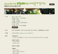 사전 팜투어는 이번 17차 세계유기농대회의 공식행사인 한국 로컬/문화 투어에서 방문하는 여행지를 미리 체험해보는 행사로 6월 중 금요일이나 토요일에 하루 일정으로 총 다섯차례에 걸쳐 실시될 예정이다. 이번 사전 팜투어에서는 17차 세계유기농대회 한국 조직위 사무국, 송촌친환경농장, 유기장류 농장 ‘가을향기’, 유기농김치를 생산하는 ‘오가원’을 방문한다. 이번 팜투어에 참여를 원하는 개인 및 단체는 17차 세계유기농대회 홈페이지(http://www. kowc2011.org)에 나와 있는 공지사항을 참조해 참가신청서를 작성한 후 17차 세계유기농대회 한국 조직위 사무국에 문의하면 된다. |