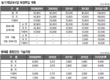 | 종자산업 기반구축…증식 등 강화 종자공급체계가 미흡하거나 수입의존도가 높은 작물의 신품종 종자(묘)생산 및 공급을 지원하는 ‘종자산업 기반 구축 사업’은 시·도, 시·군, 농협, 농업법인(영농조합법인, 농업회사법인)을 대상으로 조직배양실, 증식용 유리온실 또는 비닐온실, 육묘용 배드, 종묘의 저장 및 품질관리에 필요한 기자재 구입과 설치를 지원한다. 주요 사업인 우수품종증식보급사업에 45억1900만원, 씨감자생산기반구축사업에 20억원, 채종전환 사업에 25억원이 투입된다. 2017년까지 딸기원원묘 증식시설 3개소와 원묘 증식시설 9개소를 육성해 농가의 우량 신품종 재배면적을 80% 이상 확대하고 2013년까지 백합종구 전문생산단지 3개소를 육성해 백합종구 자급률 20% 이상을 달성한다는 계획이다. 또 2017년까지 씨감자생산기반시설 10개소를 설치해 씨감자 보증종자 공급률을 60% 이상 달성하고 마늘 우량종구 생산단지도 2017년까지 16개소 설치해 재배면적의 60% 수준인 1만2000ha 종구갱신을 실현한다는 방침이다. 2013년도 사업신청 및 수요조사는 3~5월 사이에 실시된다. 농기계 임대…고추·마늘 전용 신규 농기계 구입부담을 경감하고 농작업 기계화율을 제고해 농촌 일손부족 해소를 목적으로 하는 ‘농기계 임대사업’은 2015년까지 밭농사용 농기계 임대사업소 350개소를 설치한다는 목표다. 특히 2017년까지 고추·마늘 전용 농기계 임대사업소 38개소를 설치할 계획이다. 지원은 1개소 당 10억원(국고 50%, 지방비 50%)으로 신청기한은 전년도 12월까지다. 지원된 자금은 밭농사용 농기계와 부속작업기 구입을 원칙으로 하되, 필요시 엔진이 부착된 소형작업기의 본체 구입도 가능하다. 트랙터(40마력 이상), 이앙기, 콤바인은 구입할 수 없다. 트랙터, 이앙기, 콤바인 등 벼농사용 농기계는 농협 농기계은행사업으로 지원한다. 올해는 밭농사용 농기계임대사업 25개소, 고추·마늘 전용 농기계임대사업 5개소 등 총 30개소를 지원해 설치할 계획이다. 농기계 임대사업은 관내 농업인뿐만 아니라 해당 시·군의 농경지를 타 지역에서 출입 경작하는 농업인에게도 임대할 수 있다. 농기계 생산비축자금 1050억 지원 농기계 생산비축을 통한 적기 공급과 가격안정을 위해 농기계 생산비축자금 1050억원(신기술농기계 생산지원 20억원 포함)을 융자지원 한다. 금리는 3%로 대출기간은 1년이며 최근 2개년 간 농기계매출액이 평균 7억원 이상인 발전 가능한 업체에 지원된다. 또 시설농업기자재 생산지원자금 150억원이 책정돼 농업용기자재 생산시설 설치(장비) 및 건축비(단 부지구입비는 제외) 등에 지원된다. 지원조건은 연리 3%에 3년 거치 10년 균분상환으로 소요사업비의 80%이내이며 사업비단가는 기계 설치비 7억원 이내 건축비 7억원 이내 이다. 농기계 수리용부품·장비에 대해 210억원 자금이 지원된다. 자금용도는 농기계 수리봉사에 소요되는 수리용 부품과 수리장비로 지원액은 연간 총 사업비(부품구입금액 또는 수리장비구입)의 70%이내이며 융자조건은 연리 4%에 1년 거치후 4년 분할 상환이다. 농기계 생산시설, 비축, 사후관리 자금지원은 오는 2월 24일까지 한국농기계공업협동조합으로 신청하면 된다. 원예농산물 저온유통체계구축사업 예냉(豫冷) 등 산지 저온처리를 통해 출하조절 및 수익성 개선을 추진하는 ‘원예농산물 저온유통체계구축사업’은 농업인 5인 이상이 결성한 법인격이 있는 전문 생산자조직으로서 농수산업법인 공동지원요건을 충족하는 법인과 김치가공업체가 대상이다. 지원내용은 산지 예냉설비(개·보수, 신규), 저온저장고(개·보수, 신규), 저온선별장(개·보수, 신규), 양잠산물 저온유통시설(신규), 저온수송차량(1~5톤) 등이다. |