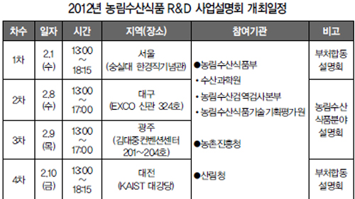 농식품부 산하 3개 기관의 R&D사업예산 규모는 농림수산식품기술기획평가원 1496억원, 수산과학원 329억원, 농림수산검역검사본부 245억원 수준이다. 농식품부는 R&D투자를 통한 기술혁신을 위해 관련 설명회를 산하기관과 농진청, 산림청 등이 참여한 가운데 2월 1일부터 10일까지 모두 4회에 걸쳐 개최한다. 특히 이번 R&D 투자 설명회는 1차(서울)와 4차(대전)의 경우 국가과학기술위원회가 주최하는 ‘2012년도 정부부처 합동설명회’의 일환으로 진행돼 국가 R&D사업에 대한 전반적인 내용을 확인할 수 있게 된다. 2차(대구)와 3차(광주) 설명회는 농림수산식품분야 R&D사업을 수행하는 3개 부처 주관으로 이뤄진다. 농식품 품질유지·안전관리 ‘확대’ 농식품부는 이번 설명회를 통해 R&D투자를 통한 기술혁신으로 영세한 영농규모, 농산물 수요 정체 등 우리 농어업의 한계를 극복해 나가는 돌파구 마련을 강조할 예정이다. 특히 골든시드 프로젝트 추진, 민간육종연구단지(Seed Valley) 조성 및 민간종자기업 육성 등을 통해 종자산업 육성 계획을 발표한다. 또 시설현대화를 위한 기술개발을 강화하며 농식품 품질유지 유통기술 연구개발 등의 분야에 중점 투자할 계획도 마련했다. 농진청은 미래 성장동력 확충을 위한 농업생명공학기술 개발 강화, FTA 대응, 기후변화, 가축질병 사전예방 등 농업 현안문제 해결을 위한 현장 실용화 기술 분야 및 농식품 안전관리 분야에 중점 투자 계획을 발표한다. 산림청은 저탄소·녹색성장을 위한 산림정책 지원 및 글로벌 협력체계 구축, 산림생물종 다양성 확보 및 안정적인 보존기반 구축 등 산림분야 민간부문의 동반성장을 통한 녹색임업기술 분야에 적극 투자할 계획이다. 지원규모와 신청, 제도 등 소개 한편 이번 설명회에서는 2012년도 농림수산식품 R&D 관계기관별 사업추진 내용을 소개한다. 또 연구자가 농림수산식품 R&D 사업에 참여하기 위해 알아야 할 사업의 지원 규모, 시기, 응모방법에 대한 안내와 더불어 R&D사업을 수행하는데 필요한 제도(연구과제 평가, 연구비 정산, 기술이전 등)에 대한 소개도 이뤄진다. 행사와 관련한 보다 자세한 내용은 농식품부, 농진청, 산림청 각 부처 또는 농식품기술기획평가원 홈페이지에서 확인할 수 있으며 농림수산식품분야 R&D 사업에 관심이 있는 연구자는 누구나 사전 신청 없이 참석할 수 있다. 설명회에 참석하기 어려운 연구자의 편의를 도모하기 위해 설명회 과정을 동영상으로 제작하여 각 기관별 홈페이지에 개시할 계획(2월 20일 이후)이다. 설명회 자료집(전자문서 및 e-Book)은 사업설명회 종료 이후(2월 13일부터)에 각 기관별 홈페이지를 통해 확인하거나 다운로드 받을 수 있다. |