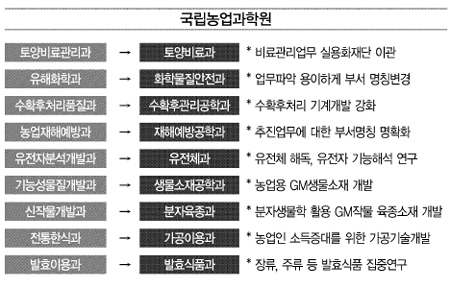 〔정원〕 본청 인력 8명 소속기관으로 이체 소속기관의 어젠다 과제 기획기능 및 현장기술지원 강화를 위해 본청 인력 8명(연구관4, 지도관2, 지도사1, 8급1)을 이체하고 본청에 개도국 협력사업 추진 등을 위한 인력 10명(연구관7, 연구사1, 5급1, 7급1)을, 소속기관에 특수견 강화 인력4명(연구관1, 연구사3)을 증원했다. 〔인사〕 조직개편에 따른 과장급 인사 <본청>▲고객지원센터장 정준용(지도개발과장) ▲연구정책국 연구성과관리과장 김경미(평가관리과장)▲농자재산업과장 장대수(농자재관리과장) ▲농촌지원국 기술보급과장 박흥규(원예특작과장) ▲역량개발과장 박공주(기술연수과장) ▲재해대응과장 김영수(식량축산과장) ▲기술협력국 국외농업기술과장 김현순(국외농업기술팀장) <농업과학원>▲기술지원팀장 김숙종(농과원 기획조정과) ▲농업환경부 토양비료과장 하상건(토양비료관리과장) ▲〃유기농업과장 지형진(유기농업과장) ▲〃농업미생물과장 김완규(농업미생물팀장) ▲농산물안전성부 화학물질안전과장 김두호(유해화학과장) ▲〃작물보호과장 고현관(작물보호과장) ▲〃유해생물팀장 윤종철(유해생물과장) ▲농업공학부 수확후관리공학과장 이강진(수확후처리품질과장) ▲〃재해예방공학과장 이용범(농업재해예방과장) ▲농업생명자원부 유전체과장 한장호(유전자분석개발과장) ▲〃생물소재공학과장 구본성(기능성물질개발과장) ▲〃분자육종과장 배신철(신작물개발과장) ▲농식품자원부 가공이용과장 한귀정(전통한식과장) ▲〃발효식품과장 김재현(발효이용과장) ▲농업유전자원센터장 김연규(농업유전자원센터소장) ▲김동헌(생명자원관리과장) <식량과학원>▲기능성작물부 잡곡과장 오인석(기능성잡곡과장) ▲고령지농업연구센터장 정진철(고령지농업연구센터소장) ▲바이오에너지작물센터장 박광근(바이오에너지작물센터소장) |
