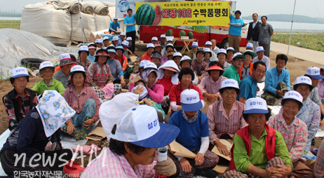 설강102수박은 저온에서도 화분 발생이 우수해 착과가 잘되고 대과생산이 용이한 품종으로 착색이 잘되고 호피무늬가 간결하고 선명한 특성을 갖고 있다. 또한 육질이 치밀해 맛이 좋고 당도가 높은 장점을 갖고 있다. 이날 평가회에는 인근 수박재배 농가와 농약판매상 사장 등 100여명 참석해 설강102 수박의 품종 설명 및 재배농가 소감, 시식회 순으로 품종평가회가 진행됐다. 특히 설강102를 직접 재배한 최영규씨는 “재배방법이 까다롭지 않고 맛이 좋고 당도가 높아 상품성이 우수해 소비자에게 사랑받을 수 있는 수박”이라며 설강102수박 재배소감을 밝혔다. |