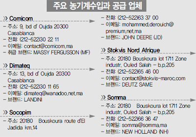 | 모로코 농기계 시장 규모는 연간 20억 디람(2억4000만 달러)으로 그 중 트랙터 판매가 1만3000여 대로 10억 디람(1억2000만 달러), 시장의 절반가량을 차지하며 가장 큰 비중을 나타내고 있는 것으로 나타났다. 쟁기, 파종기 등의 다른 농기계 시장은 5억~10억 디람의 규모로 파악되었다. 모로코 대외무역부와 카사블랑카무역관에 따르면 모로코 정부는 최대한도 9만 디람(1달러=8.4디람)의 기준을 정하고 농기계 구매의 최대 40%까지 보조금을 지원하고 있다. 스페어 파트는 보조금 지원 대상에서 제외된다. 모로코 농업인들은 소득 수준이 중하위권으로 전적으로 날씨와 관개에 의존하며 전통적인 방법으로 농사를 짓기 때문에 신제품보다 중고 농기계 구매가 일반적이다. 가장 중시하는 제품 구매 조건은 품질이 아닌 가격으로 알려져 있다. 따라서 유럽산, 미국산 제품들에 비해 낮은 품질일지라도 가격 경쟁력이 우수한 중국 제품을 선호하는 경향이 높다. 농기계 구매 의사가 없는 농업인들은 대기업의 농기계 임대 시스템을 이용하고 있다. 대부분의 농기계 판매 업체들은 AMIMA(ASSOCIATION MAROCAINE DES IMPORTATEURS DE MA MATERIEL AGRICOLE 모로코농업기계수입조합)의 회원으로 가입되어 있다. 관개 설비와 온실 설비 시장의 경쟁이 치열한 것도 모로코 농기계 시장의 특징 중 하나이며 구매력이 낮은 모로코 농업인들을 위해 중고시장, 임대시장이 발달되어 있다. 주요 취급 농기계목록과 가격을 살펴보면 트랙터(평균가격 12만5000 디람), 리퍼(평균가격 120만 디람), 펌프(평균가격 3400 디람) 등이다. |