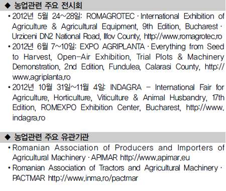 | 루마니아는 남동부 유럽, 발칸반도 북부에 위치해 터키, 중동, 우크라이나, 러시아 수출시장을 타깃으로 한 지리적 물류의 장점이 있는 지역으로, 세계적인 경기침체에도 불구하고 일부 외국인 투자 제조업체들의 투자가 활발하게 진행되고 있다. 2007년 EU 회원국으로 가입해 기존 회원국들보다 상대적으로 신입회원인 루마니아는 다른 동유럽 EU국가와 비교할 때 인구 2000만에 이르는 큰 내수시장을 갖고 있기 때문에 EU에서 대규모 구조조정기금을 할당받기도 했다. EU는 약 275억 유로를 교통개선, 시골지역 개발, 에너지, 환경에 이르기까지 각종 개발 프로젝트를 위해 루마니아에 배정한 것으로 알려졌다. 그러나 이 기금에서 루마니아가 확보해서 활용한 흡수율(Absorption rate)은 신규 10개의 EU 국가 중 최하위를 기록하고 있다. EU는 매년 농업분야와 농부들이 농기계와 장비를 구매하는데 수백만 달러를 제공하고 있어 중요한 재정적 원천의 역할을 하고 있다. 루마니아 농부들은 2007년부터 지난해에 걸쳐 총 42억 달러의 기금을 장비 현대화를 위해 사용한 것으로 나타났다. 부쿠레슈티무역관에 따르면 외국 기업은 직접적으로 EU 기금의 프로젝트에 참여할 수 있을 뿐만 아니라 EU 기업들과 파트너를 구축하여 프로젝트에 구체적으로 참여할 수 있다. 특히 한국 농기계 제조업체에게 루마니아는 단기·중장기 모두 매우 전도유망한 시장으로 나타난다. 지난해 루마니아 경제가 전반적으로 침체됐음에도 농기계 시장은 나쁘지 않은 것으로 조사되었다. 농기계 딜러 등 관련업계에 따르면 판매량이 전년보다 무려 20% 이상 증가했고 이러한 현상은 2012년에도 지속적으로 나타나고 있다. 다만 루마니아 농토는 수많은 주인들로 나뉘어져 있어 농기계 구매 등과 같이 생산성 증가에 필요한 투자에 한계를 보이는 것 또한 사실이다. 루마니아는 EU 회원국이므로 EU 제품은 무관세이며 EU와 FTA를 체결한 우리나라도 동일한 혜택을 누릴 수 있다. 공산주의 정권 하에 운영되던 루마니아 트랙터와 농기계 제조 국영회사는 이제 일부는 민영화가 됐거나 EU와의 경쟁에서 살아남지 못했다. 트랙터와 농기계에 있어 루마니아 자체의 경쟁력이 부족해 대부분의 제품을 수입에 의존하고 있다. 미국의 대표적인 기업은 AGCO, Titan Machinery, CNH, John Deere 등이다. 이외, New Holland, Poettinger, Hardi, Bogballe, Guestrower 등이 수입 판매되고 있다. 최근에는 대용량의 최신식 농기계 수요가 급격히 상승하고 있지만, 아직까지 시장에서는 100~150마력 제품들이 베스트셀러이다. 관개장비 등 농업관련 기자재 수요도 상승 루마니아의 주요 생산 농산물은 옥수수, 밀, 해바라기 등이다. 농기계뿐 아니라 관개장비, 온실 장비, 비료, 종묘 등 농업관련 기자재의 수요도 함께 높아지고 있다. 관개장비 수출업체로는 미국계 Valmont와 Toro 회사가 소규모 관개시스템 제조업체로 자리잡고 있다. 이 외에 가축 장비시장에서는 Hog Slat와 Smithfield가 좋은 성과를 거두는 것으로 나타난다. 2012~2013년을 루마니아 와인 산업에서 새로운 성장의 해로 보는 전문가들이 많다. 또 루마니아의 채소생산은 외국투자가에게 매우 매력적인 분야로 인식되며 독일, 이스라엘 회사는 온실 기술과 장비를 매우 공격적으로 마케팅하고 있다. |