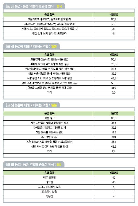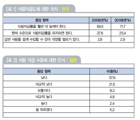 농식품 구매기준 조사에서는 한국소비자는 품질과 원산지를, 일본 소비자는 안전성을 우선 고려하는 것으로 나타났다. 한국은 채소·과일·수산물·외식의 경우 품질(맛)을 최우선으로 고려하고 곡물·육류는 원산지(국산여부)를 우선 고려하는 것으로 응답했다. 안전성에 대한 관심도 전반적으로 높았다. 일본은 국산 선호 소비자는 안전성을 최우선 고려(89.0%)하고 수입산 선호 소비자는 가격(80.0%)을 가장 중시했다. ◆한·일 모두 식량자급률 제고 필요성 인식 국내 식량 공급과 식량 자급률에 대한 의식 조사에서는 한·일 모두 식량 자급률 제고의 필요성을 인식했다. 한국 소비자들의 식량 자급률 제고가 필요하다는 의견은 2006년 59.5%에서 2008년 71.7%로 높아졌다. 일본은 현재 칼로리 기준 40%인 식량 자급률 수준이 낮다는 응답 비중이 79.1% 달했으며, 식량 자급률 제고가 필요하다는 의견은 2008년 무려 93.3%에 달했다. ◆日, 식량공급 안전·안심·안정 ‘3安’ 요구 농업·농촌의 기능에 대한 질문에 한국 도시민의 85.9%가 농업·농촌의 역할이 중요하다고 응답했다. 일본은 농업·농촌의 주요 기능으로 안전한 식량의 안정적 공급을 꼽았다. 특히 일본은 농업 기능 중 식량 공급에 있어 안전, 안심, 안정의 ‘3安’에 대한 요구 외에도 환경 측면에 대한 고려도 높은 비중을 차지했다. 농촌 기능에서도 식품 공급 기능을 강조한 응답 비중이 높았다. 환경측면의 기능과 삶의 공간을 제시한 비중도 높은 것으로 조사됐다. ◆日, 경제효율성과 보전기능 모두 중시 농업·농촌 정책 방향에 대한 의식 조사에서는 한국의 경우 농업인들은 “개방 후 농업 피해 대책”, 도시민은 “경쟁력 강화”를 최우선 과제로 꼽았다. 농업인 응답자의 절반 가까이가 개방 확대에 따른 농업피해 대책 마련이 필요하다고 응답한 반면, 도시민은 농업예산 지원의 우선순위가 농업 경쟁력 강화에 있다고 응답해 인식의 차이를 드러냈다. 일본은 경제적·공익적기능을 모두 충족해야 하며, 경제적 효율성 및 국토·환경보전기능을 모두 중시해야 한다는 응답이 다수를 차지했다. EU는 가격 안정, 신선·안전한 식품 생산, 농가소득 안정이 중요하다는 응답이 많았다. 또소비자 후생측면과 생산자 소득안정에 대한 우선순위가 높았다. |