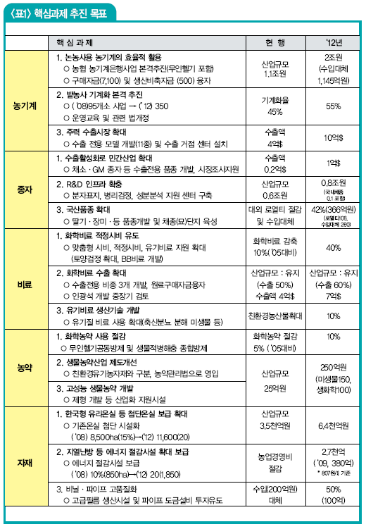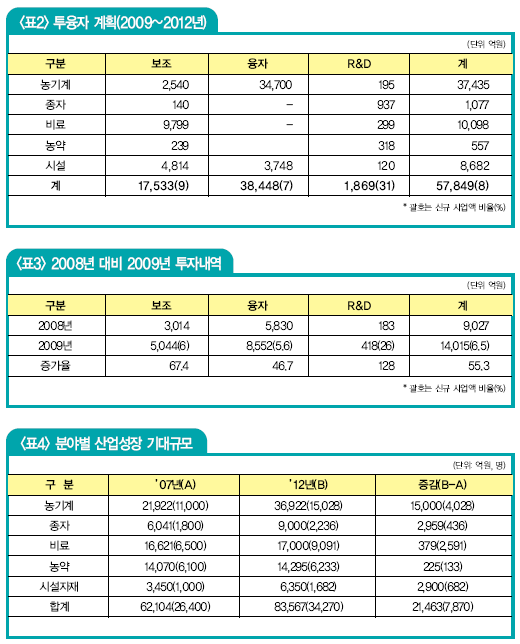 또 하우스용 파이프 KS규격 및 필름 표준규격 개정을 1월 완료해 불합리한 유통관행을 정비해 나가기로 했다. - 시설원예에너지이용 효율화사업 2009년 260억원 - 시설원예 지열에너지 보급지원(지식경제부) 2009년 945억원 ◈2012년까지 4년간 총 5조6000억 투입 농식품부가 제시한 농자재산업 발전대책과 관련한 투융자계획<표2>에 따르면 2009년부터 2012년까지 연평균 1조4000억원, 총 5조6000억원이 투입된다. 이 가운데 보조 R&D 지원은 1조9000억원으로 35%를 차지한다. 또 2008년 대비 2009년 농자재산업 관련 예산은 55% 증액<표3>됐다. 이 가운데 신규사업이 전체 예산의 6.5%(904억). 특히 기존의 가격안정 대책사업 예산이 대폭 증액돼 4987억원에 달한다. 농식품부는 이번 농자재산업 발전대책이 시행되면 2012년까지 산업규모가 34% 성장<표 4>할 것으로 기대하고 있다. 또 수출은 8억불에서 18억불로 125% 증가하고 로열티포함 수입 대체 효과는 연간 5305억원에 달할 것으로 추산했다. 고용창출도 7870명에 이를 것이라는 전망이다. ◈전담부서 신설과 지원체계 조정·강화 농식품부는 농자재산업 발전대책을 효율적으로 추진키 위해서는 농자재산업을 총괄할 수 있도록 부내 관련기능을 조정해 농자재산업과(가칭)를 신설할 계획이다. 또 분야별 수출활성화 지원체계와 R&D 및 정책사업 추진체계를 개편키로 했다. 현재 농기계와 종자는 농생명산업팀, 비료와 농약은 친환경농업팀, 온실시설은 채소특작과로 분산돼 있다. 특히 축산기자재와 온실부자재는 담당과 자체가 부재한 실정이다. 이번 농식품부의 계획대로 농자재산업과가 신설될 경우 각 산업별 시너지 효과가 기대되고 있다. 정책 지원체계 개선을 위해서는 연계기관 간 전담 역할을 조정 및 강화하기 위해 핵심과제는 농식품부에서 총괄하고 미래기술은 농진청, 수출과제는 aT에서 전담조직을 운영한다는 계획이다. 또 기계·화학·철강 및 마케팅 지원책은 관련 지식경제부, 무역협회, 중소기업진흥공단 등과 정례적인 협의체를 운영하는 등 타 부처 연계사업 및 R&D는 범부처적 협의 지원체계를 구축키로 했다. ◈고시·훈령 38종 → 22종으로 통폐합 농촌진흥청은 농자재관리과장을 팀장으로 하는‘농자재 제도개선 TF’를 구성했다. 특히 농약, 비료, 친환경농자재, 유전자원(종자) 등 4개 분과별 T/F팀을 구성하고 농자재 관련 법령 및 제도개선 작업에 나섰다. 이번 T/F팀은 지난해 11월 13일 관련분야 전문가 및 협회 관계자 등으로 구성하고 올해 5월말까지 농자재 관련 제도 개선방안에 대한 최종안을 마련한다는 계획이다. 농자재 제도개선 TF팀은 농진청과 농산물품질관리원, 국립종자원, 농촌경제연구원, 경기도청, 농협중앙회, 농약·비료·종자 관련 협회 등 35명으로 구성됐다. TF팀은 2차례에 걸친 회의 결과를 토대로 농약관리법, 친환경육성법 등 5개 법령의 개선안을 마련했다. 법적근거가 동일하고 유사한 성격의 고시 31종을 20종, 훈령은 7종에서 2종 등 총 38종의 고시·훈령을 22종으로 통폐합해 단순화했다. ◈분야별 공청회 거쳐 5월말까지 법 개정 앞으로 T/F팀 농약분과에서는 판매기록 의무화, 안전사용기준 개선, 농약 등록기준 강화 등의 개선방안을 추진한다. 비료분과는 유기질비료 등의 품질 강화를 위한 장부 비치 의무화 방안을 검토한다. 친환경농자재분과에서는 사후관리 강화방안으로 목록공시 자재의 품질관리 및 벌칙 기준 마련 등이 검토된다. 또 유전자원(종자)에 대해서도 육성보상금 기준 현실화, 국외 반출 등급 개선 방안을 마련할 계획이다. 이광하 농진청 농자재관리과장은 “제도개선의 핵심은 안전하고 품질 좋은 농자재를 공급하고 불법제품이 유통되지 않도록 하는 것이 목표”라며“제도개선 및 법령 정비는 분야별로 간담회와 공청회 등의 절차를 걸쳐 내년 2월까지 의견을 수렴하고 법 개정 시기는 5월이 될 것으로 전망 된다”고 밝혔다. ◈빠른 시일 내 ‘농자재산업과’ 신설돼야 농식품부의 농자재산업 발전대책은 모처럼 농산업계를 한 눈에 볼 수 있는 자료 분석과 함께 구체적인 육성책이라는 것이 TF 참석자들과 관련업계의 반응이다. 정학수 농식품부 차관은 지난해 12월 11일 농기계조합이 개최한 ‘농기계인의 밤’에서 “강한 농업발전을 위해서는 경쟁력 있고 우수한 농자재 산업이 뒷받침 돼야 한다”며 “정부는 가능한 선에서 농자재산업 육성을 위한 지원에 나설 것”이라고 밝혀 이번 농자재산업 발전대책은 농식품부 내에서도 힘을 얻을 것으로 기대되고 있다. 다만 농식품부는 농자재 수요자 중심의 정책기조로 농산업계의 육성보다는 농가의 경영안정에 정책지원이 집중될 수밖에 없다는 입장을 밝히고 있다. 이에 따라 농자재산업 발전대책은 산업계에 생산·가동·수출보조 등 직접적인 지원이 부족하다는 아쉬움을 남기고 있다. 그럼에도 불구하고 농자재산업 발전대책이 주목 받을 수밖에 없는 이유는 그동안 농자재업계가 주장해온 농자재산업을 아우르는 전담부서 ‘농자재산업과’ 신설의 필요성을 제기하고 이를 반영함으로써 획기적인 일로 평가 받기에 충분하다는 진단이다. 특히 발전대책이 체계적으로 진
