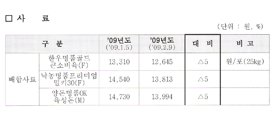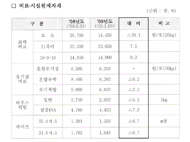 농협은 경기침체로 어려운 농업인의 영농비 부담을 덜어주기 위해 ▲화학비료 평균 4.3% ▲사료 평균 5% ▲하우스용 필름 평균 6.3%, 파이프 평균 6.7% 등 2009년 주요 영농자재 공급가격을 1월(사료는 2월 초순)부터 전격 인하하기로 했다. 이에 따라 올해 화학비료 주요 비종인 요소는 20kg 1포 당 작년 하반기("08.7월 말) 20,700원에서 14,450원으로 30.1%, 축산물 생산비의 70%를 차지하는 사료는 평균 5%(1kg당 25원), 비닐하우스용 삼중 EVA필름은 1kg당 4,780원에서 4,400원으로 7.9% 인하된다. 농협의 이번 영농자재 공급가격 인하 조치로 농가는 올 한 해 동안 약 1,200억원(화학비료․시설원예자재 534억원, 사료 660억원)의 영농비 절감 효과가 있을 것으로 농협측은 보고 있다. 이와 함께 정부와 농협은 올해 농업인 비료 구입분에 대하여 총 2,360억(정부 1,508억, 농협 692억, 남해화학 등 업계 160억)을 투입한다. 이를 통해 전년도("08년도 상반기) 가격 대비 올해 비료 가격 인상분의 약 80%가 보전된다. 정부와 농협은 또한 화학비료의 사용량 절감과 친환경농업 확산을 위해 ▲유기질비료 1,218억원(전년 대비 58억원 증가) ▲토양개량제 814억원 ▲‘푸른들가꾸기’종자 269억원을 지원키로 했다. 한편 축산농가 사료비 부담경감을 위한 특별 사료구매자금을 지난 해 1조 5천억원을 지원한데 이어, 올해에도 추가로 1조원이 투입된다. 이에 따라 농가가 부담하는 이자는 올해에만 총 1,166억원(정부 954억, 농협 212억) 경감되는 효과가 있다. 다만, 농협은 농약가격에 관하여 업계에서 환율 상승으로 36% 이상 인상할 것을 요청하는 가운데, 농업인 부담경감을 위해 인상폭을 업계 요구 수준의 절반가량인 평균 18%로 정했다. 농협은 농약가격을 최근 7년간 인하 내지는 동결해왔다. |