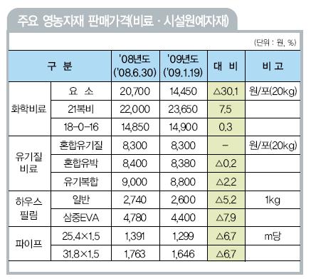 | 농협이 농업인의 영농비 부담 경감을 위해 올 1월부터 공급하는 주요 영농자재 가격을 대폭 인하한다. 배합사료가격도 2월 중에 내리기로 했다. 그러나 비료값은 인하 폭이 낮아 농가부담 경감 효과가 미미하다는 주장이 일고 있다. 또 농약은 환율 상승과 원제가격 인상 등으로 36% 이상 인상요인이 발생했으나 그 절반수준인 18% 인상하는 선에서 가격을 결정지었다. 1200억원의 영농비 절감 효과 농협은 경기침체로 어려운 농업인의 영농비 부담을 덜어주기 위해 ▲화학비료 평균 4.3% ▲하우스용 필름 평균 6.3% ▲파이프 평균 6.7% 등 2009년 주요 영농자재 공급가격을 1월부터 전격 인하하기로 했다. 배합사료는 2월 초순부터 평균 5% 인하키로 했다. 이에 따라 올해 화학비료 주요 비종인 요소는 20kg 1포 당 작년 2008년 7월 말 기준 2만700원에서 1만4450원으로 30.1%로 인하된다. 축산물 생산비의 70%를 차지하는 사료는 평균 5%(1kg당 25원), 비닐하우스용 삼중 EVA필름은 1kg당 4780원에서 4400원으로 7.9% 인하된다. 농협의 이번 영농자재 공급가격 인하 조치로 농가는 올 한 해 동안 약 1200억원(화학비료․시설원예자재 534억원, 사료 660억원)의 영농비 절감 효과가 있을 것으로 보고 있다. |