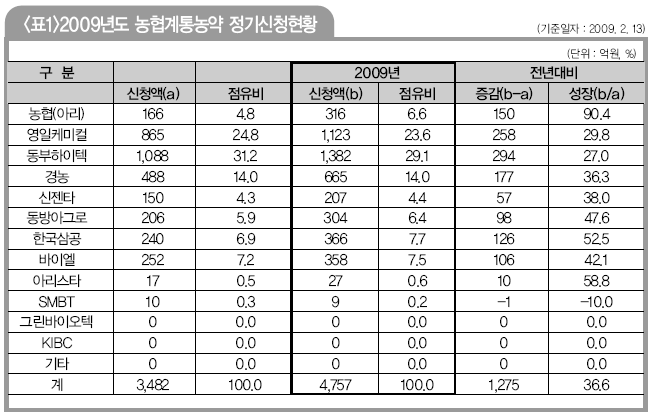 | 올해 농협에서 공급하는 계통농약이 크게 늘어날 전망이다. 농협중앙회와 작물보호제업계에 따르면 올해 회원농협의 계통농약 신청금액은 지난해의 3482억원보다 36.6% 증액된 4757억원에 이르는 것으로 집계됐다. 계통등록 품목수도 642개로 지난해 615개 보다 4.4%인 27개 품목이 늘었다. 특히 올해 농협아리품목 신청금액은 316억원으로 지난해의 166억원보다 90.4%(150억원) 가 늘어났다. 이밖에 업체별 계통공급실적을 보면 영일케미컬이 올해 1123억원으로 지난해 865억원보다 29.8%인 258억원이 증액됐으며, 동부하이텍 1382억원, 경농 665억원, 신젠타 207억원, 한국삼공 366억원,바이엘 358억원, 동방아그로 304억원, 아리스타 27억원, SMBT 9억원 순이다.<표1> 이는 올해 농협계통농약 공급가격이 국제 원제값 상승과 원·달러환율 급등에 따라 전년대비 평균18%(총액대비 약 627억원) 인상된 점을 감안하더라도 지난해보다 648억원 가량이 순증됐다. 국내 농약시장 매출규모를 1조1000억원 가량으로 추산할 때 시판 대비 계통농약의 점유율은 43.2%를 넘어선 |