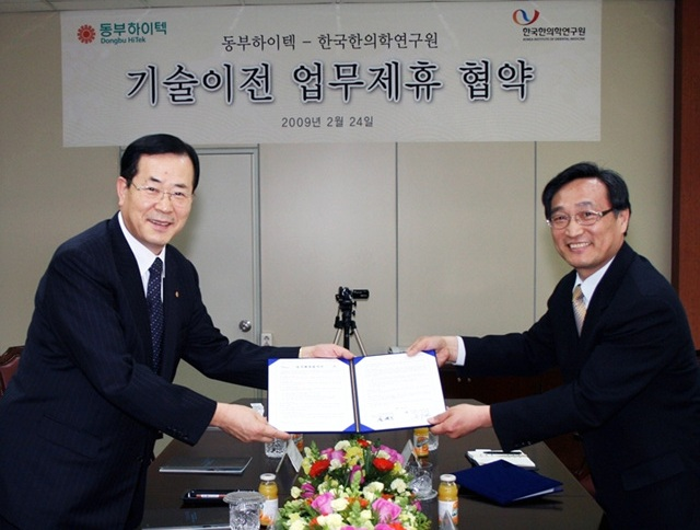 동부하이텍(대표 차동천 사장)은 지난달 24일 대전 대덕연구단지 내 동부기술원에서 한국한의학연구원(원장 김기옥)과 한방기능성 소재 및 기술이전을 위한 업무협약을 체결했다. 이에 따라 한국한의학연구원의 연구성과가 동부하이텍을 통해 보다 쉽게 상품화될 것으로 기대를 모으고 있다. 동부하이텍과 한국한의학연구원은 이날 협약을 통해 △이전가능기술 및 도입희망기술의 발굴 △기술이전을 위한 중개ㆍ알선 및 중재 △기술이전 관련 자료 수집ㆍ조사ㆍ분석 등에 대해 상호 협력하기로 합의했다. 양측은 또 △기술이전 관련 네트워크 및 DB의 공유 △기술이전 활성화를 위한 세미나ㆍ교육 등 각종 행사 공동개최 △기술의 사업성ㆍ시장성 평가방안 마련 등에 대해서도 지속적으로 논의해 나가기로 했다. 김기옥 한국한의학연구원장은 “이번 협약은 한의학연구원의 다양한 연구성과를 산업화하기 위한 것”이라며 “민간기업과의 기술이전 협약을 통해 한의학연구원이 개발한 한방 기능성 소재 등의 산업화가 활성화되길 기대한다.”고 밝혔다. 차동천 동부하이텍 대표도 “한국한의학연구원의 우수한 기술과 소재를 활용할 수 있게 돼 기쁘다”며 “앞으로 천연작물보호제, 천연비료, 기능성 건강소재, 동물약품 등 바이오제품 개발에 더욱 주력함으로써 21세기 친환경 바이오기업으로 거듭날 것”이라고 말했다. |