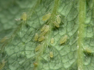 ② 진딧물류 : 초기에는 잎 뒷면 또는 새순부위를 보는데 새순이나 꽃대 주변에서 보이면 약 1개월 전에 발생된 것으로 추정한다. 진녹색(검은색에 가까움) 의 진딧물이 보이면 대부분 목화진딧물일 가능성이 높고, 그 외 딸기뿌리진딧물, 싸리수염진딧물 발생이 있을 수 있다. 간혹 애못털진딧물이 심하게 발생할 수 있는데 모두 연두색 계통이다(진디면충좀벌 이용). 콜레마니진디벌, 진디벌(어비진디벌)과 진디혹파리 천적을 사용할 수 있다. 천적유지식물(뱅커플랜트)은 진딧물 발생 여부와 관계없이 아주심기 할 때부터 활용하는 것이 가장 좋다. 진디혹 |