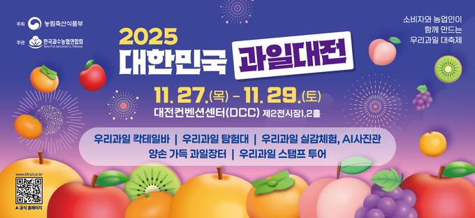 국내 과수산업의 현재와 미래를 한눈에 볼 수 있는 국내 최대 규모의 과수 전문 박람회, 제15회 『2025 대한민국 과일산업대전』이 오는 11월 27일(목)부터 29일(토)까지 3일간 대전컨벤션센터(DCC)에서 개최된다.