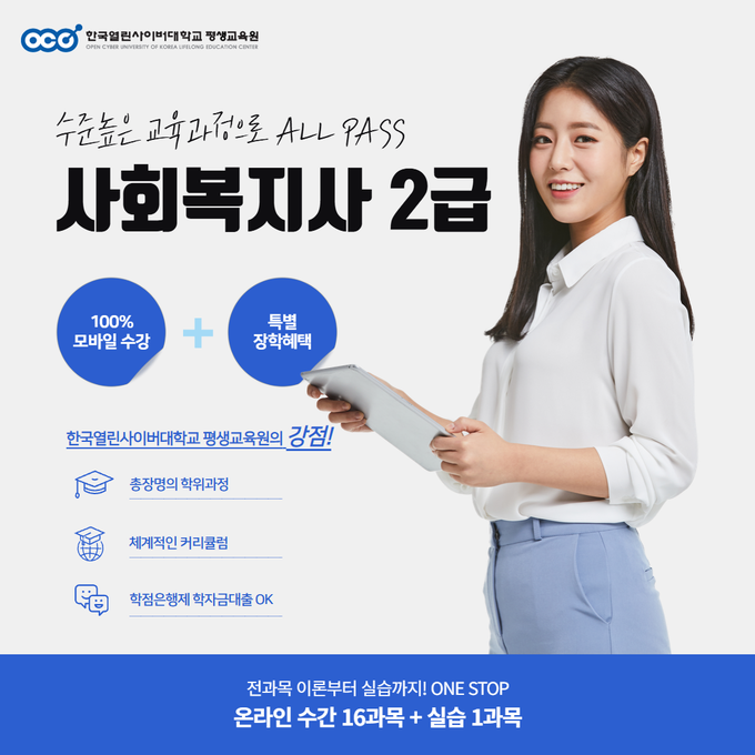 이에 한국열린사이버대학교 평생교육원이 ‘사회복지사 2급 자격 취득 과정’의 신규 수강생을 11월 12일(수)까지 모집한다고 밝혔다.