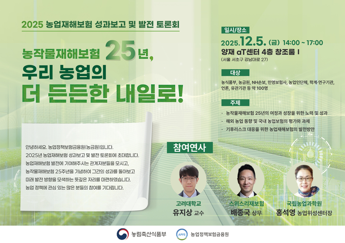 농업정책보험금융원(원장 서해동, 이하 농금원)은 오는 12.5.(금) 오후 2시, 서울 양재동 aT센터에서 「2025년 농업재해보험 성과보고 및 발전 토론회」를 개최한다. 이번 행사는 농작물재해보험 도입 25주년을 맞아 제도의 성과를 돌아보고, 급격히 변화하는 기후 환경 속에서 농업재해보험의 지속가능한 발전 방향을 모색하기 위해 마련됐다.