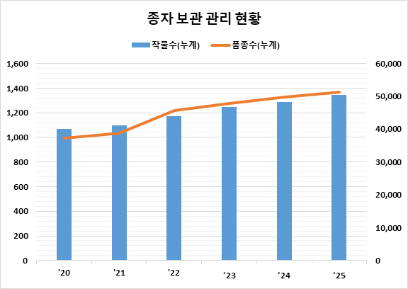 국립종자원 종자검정연구센터는 2014년 설립 이후 국내 유통 종자의 품질과 신뢰 확보를 위해 기술 연구를 수행해 온 전문기관이다. ‘시드큐브’는 이러한 센터의 기능을 실질적으로 뒷받침하는 핵심 시설로, 현재 ‘시드큐브’에는 1,344개 작물, 51,287점의 종자가 보관되어 있다.