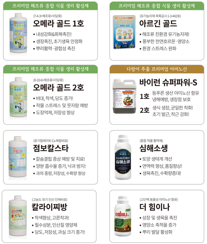 아르긴 골드, 오메라 골드 2호. 다랑어 추출 프리미엄 아미노산 바이런 슈퍼파워-S, 점보칼스타, 심해소생. 칼라이찌방, 더 힘이나, 유기킬레이트 Ca 복합비료, 활력제, 유기 인산 인체비료, 고단백 동물성 아미노산 함유, 해조류, 이당류, 비대, 착색, 당도, 칼슘, 낙과 방지, 생육촉진, 착과