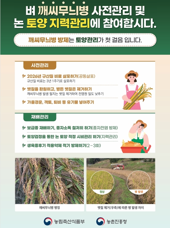이와 함께 지난해 1,000헥타르(ha) 이상 깨씨무늬병 피해가 발생한 시군(21개 시군 29,379ha)을 집중적으로 관리(1~3월)할 방침이다.