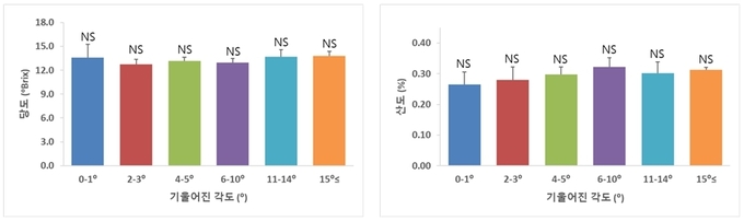▲기울어진 각도에 따른 당도(Brix)와 산도(%) 비교