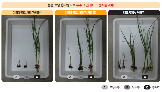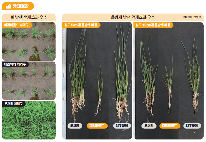 미리매골드는 피, 물달개비, 가막사리, 여뀌, 밭뚝외풀, 알방동사니 등 일년생잡초에 우수한 방제 효과를 보인다. 특히 피 방제 효과뿐만 아니라, 난방제 잡초인 올방개 발생 억제에도 우수한 성능을 보여 올방개 방제의 초기 관리에도 활용성이 높다. 또한 논조류 억제효과가 좋아서 표층 박리 발생을 줄이고 벼 초기 활착에도 도움을 줄 수 있다.