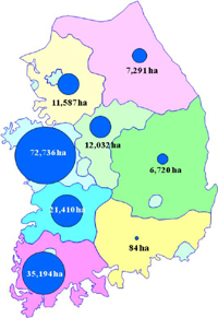 경상북도 6.0%, 경상남도 1.0%는 상대적으로 낮았지만 이는 토양채취와 약제처리과정에서 발생될 수 있는 오류일 것으로 사료된다. 서해안 설포닐우레아계 선호로 발생 높아 논토양 채취로 추정된 전국 제초제 저항성 논잡초의 발생현황은 그림 1과 같이 서해안과 인접한 충남, 전북, 전남지역에서 저항성 논잡초의 발생이 높았다. 즉 서해안은 간척지와 담수직파논이 많고 이들 지역에서 벼에 상대적으로 안전한 설포닐우레아계를 선호하는 관계로 저항성잡초의 발생이 높았던 것으로 보인다. 제초제 저항성 논잡초의 초종별 발생 추정면적 중 가장 넓은 초종은 물달개비 6만5313ha로 전체 39.1%를 차지한다. 그 다음 올챙이고랭이(2만9396ha), 알방동사니(2만4504ha) 순이었다. 이들 3초종은 전국적으로 고르게 발생해 제일 문제되는 잡초들이다. 이와 함께 미국외풀 1만3964ha(8.4%), 강피 5.1%가 다음을 차지했다. 전라남도에서 발생돼 농도별 확인시험이 필요한 잡초로는 갯드렁새, 밭뚝외풀, 여뀌바늘, 등애풀 등이 있다. |