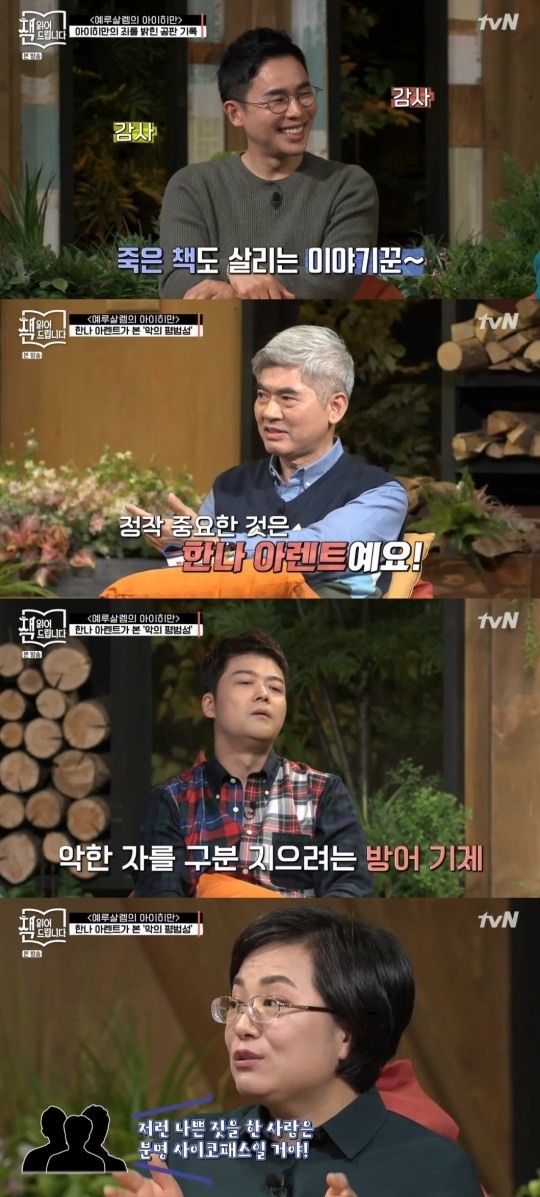 [농기자재신문=박혜린 기자] 5일 방송된tvN '책 읽어드립니다'에서는 설민석, 전현무, 이적, 문가영과 소설가 장강명, 대검찰청 과학수사자문위원 김태경 교수, 포항공대 이진우 교수가 함께 유대인 학살 나치 전범의 공판 기록을 담은 '예루살렘의 아이히만'을이야기로 풀어낸다.