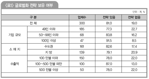 특히 우리나라 수출 중소기업의 81%는 글로벌화 전략을 보유하고 있으나 여전히 글로벌 시장 및 고객관련 분석 정보 부족 등이 수출을 어렵게 만드는 것으로 나타났다. 중소기업중앙회(회장 김기문)가 최근 300개 수출중소기업을 대상으로 조사한 ‘중소기업 글로벌화 추진을 위한 실태조사’에 따르면 우리나라 수출 중소기업의 81%는 글로벌화 전략을 보유하고 있다. 100인 이상 기업 91.5%, 50~100미만 83.8%, 50인 미만 기업 77.3%가 글로벌화 전략을 갖추고 있는 것으로 나타났다.<표 1> 글로벌화 추진형태로는 ‘수출중심의 글로벌화’가 75%, ‘기술, 디자인 등 국제 전략적 제휴’ 31%, ‘현지법인 설립 및 생산기지 이전 등 해외직접투자’ 22.7% 순이었다. 특히 EU와 주로 거래하는 기업에서는 ‘국제 전략적 제휴 적극적 활용’에 의한 글로벌화 추진이 43.4%로 비교적 높게 나타났다. 설문 결과 그러나 글로벌화 추진시 중소기업들은 여전히 여러 가지 애로점이 있는 것으로 나타나 개선과 지원이 필요한 것으로 드러났다. 특히 ‘글로벌시장 및 고객관련 분석 정보 부족’과 ‘낮은 브랜드 파워’가 각각 37.3%, 33.3%로 나타났으며 ‘해외 판매 네트워크 부재’도 27.3%로 조사돼 최근 각종 경영정보의 홍수에도 불구하고 정작 중소기업에 도움이 되는 자료는 부족한 것으로 분석됐다. 중소기업들이 원하는 글로벌화 추진을 위한 정부지원책으로는 해외마케팅 부분에서 ‘해외전시회 참가지원 등 지원 확대’ 57.3%, ‘현지 마케팅 전문가와의 1:1상담지원’ 31.3%, ‘해외바이어초청 국내전시회 지원’ 26.7% 등으로 나타났다. R&D 분야 지원책으로는 ‘해외규격인증획득 지원 등 TBT해소’ 46.7%, ‘글로벌중견기업 등 성장잠재력 보유기업 중점육성’ 36%, ‘해외납품 연구개발 프로젝트 우선 지원’ 29.3% 등으로 조사됐다. 중소기업들이 점차 늘고 있는 기술규제에 대한 대비책 마련 및 까다로운 국제인증 획득을 위한 정부지원을 원하고 있는 것으로 해석됐다. |
