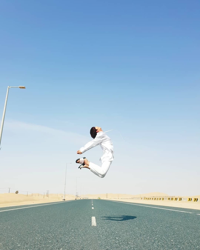 건민은 지난 9일 인스타그램에 사진과 함께 “좋은 경험 고마워요 아부다비 شكرا لكم على هذه التجربة الرائعة ابو ظبي”라는 글로 근황을 공개했다.