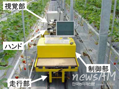 딸기 자동 수확 로봇 “야간 1개당 9∼12초” 생물계특정산업기술연구지원센터와 에스아이정공이 지난 2002년 공동개발에 나서 2008년 완료한 ‘딸기 자동 수확 로봇’은 수작업 로봇으로 야간에 레일 위를 이동하면서 딸기를 자동 수확한다. 과실의 인식은 카메라 3대, 편광 필터 부착LED조명 5개, 초음파 센서로 하고 좌우의 카메라로 촬영해 익은 딸기만을 선택, 3차원 위치 측정으로 오차를 방지한다. 과실을 가까이 끌어당기기 위해서 흡착해 가위로 절단한다. 딸기 1개 수확시간은 9∼12초로, 야간 무인 수확을 실현해 생산성을 향상시켰다. 현재까지 나타난 일본 농업의 IT 융합 핵심 솔루션은 농업용 전문 센서로 나타나고 있다. 특히 농지 성분 분석 센서, 초청밀 GPS 위치 정보 센서, 비접촉 성분 측정 센서 등이 개발되고 있다. 농지의 강도, 공기량 측정 센서 등의 개발도 이뤄지고 있지만 개발에 성공한 기업은 아직 나타나지 않고 있다. 또 농업 IT분야는 현재 시범사업 단계로 글로벌 핵심 기술 보유 기업과의 기술 제휴를 통한 제품 개발이 필요한 실정이다. |