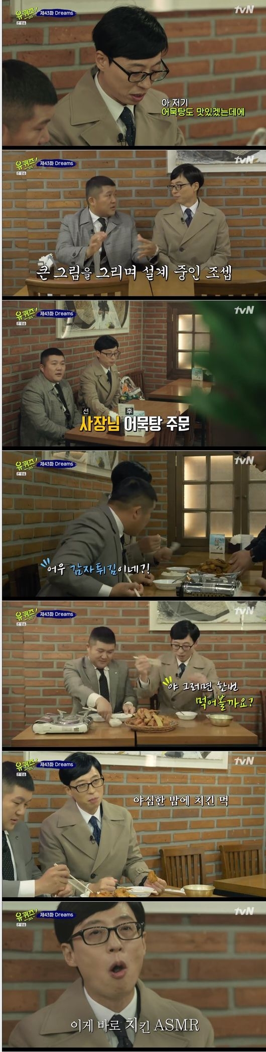 "겉바속촉"이라면서 조세호는 먹방을 이어갔고 유재석은 "우리에게는 점심이지만 보시는분들은 야식"이라면서 "이 장면이 자극이 될 거"라고 말했다.