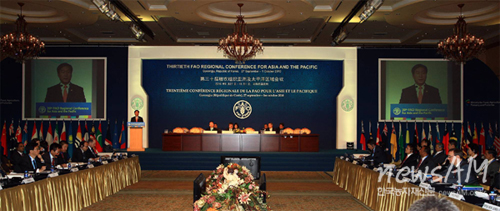 특히 지난달 27일부터 29일까지 아시아 태평양 지역 28개국 대표단 등 278명이 참석한 ‘제30차 FAO 아시아·태평양지역 고위급회의’에서는 식량안보 및 기후변화 등과 관련된 8개 의제에 대해 다양한 의견 개진과 함께 ‘역내 지속가능한 식량 안보를 위한 작물생산성 증대방안’ 등에 대해 중점 논의했다. 이번 지역총회에는 러시아가 아태지역 정식 회원국으로 처음 참석해 최근 자국의 곡물수출 제한조치 배경을 설명하고 기후변화 및 식량안보 등에 대한 높은 관심을 표명했다. 각료급 회의는 지난달 30일부터 10월 1일까지 열리며, 29개국 약 200여명의 대표단이 참가해 ‘식량안보정상회의 및 제36차 FAO 총회에서 제기된 사안’ 등의 의제를 논의한다. |