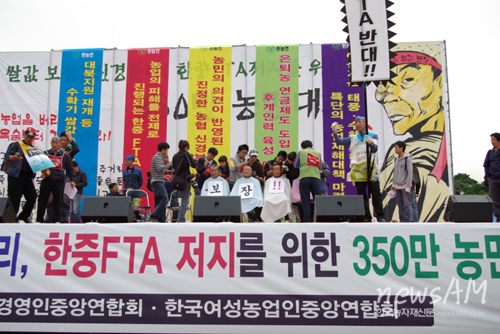 이날 대회에는 전국 각지에서 1만5000여명(경찰추산 6500여명)이 참가해 “지금 현장 농촌은 지속적인 쌀값 폭락과 재고 문제 등으로 큰 홍역을 치르고 있다”면서 “돈 버는 농업, 살맛나는 농촌을 만든다던 이명박 정부가 농업을 포기하려고 하는가”라며 탄식했다. 이들은 또 ▲수확기 쌀값보장 ▲정부자원의 대북지원 재개 ▲한중 FTA 추진 중단 ▲은퇴농민, 여성농민에 대한 대책 마련 ▲농업재해 보상단가 인상 ▲농업재해보험법 개정 등을 요구했다. 농업인들은 집회를 마친 오후 4시10분부터 약 1시간 가량 문화마당 인근 약 2㎞ 구간에서 가두시위(문화마당~MBC~지하철 5호선 여의도역~산업은행)를 벌였다. |