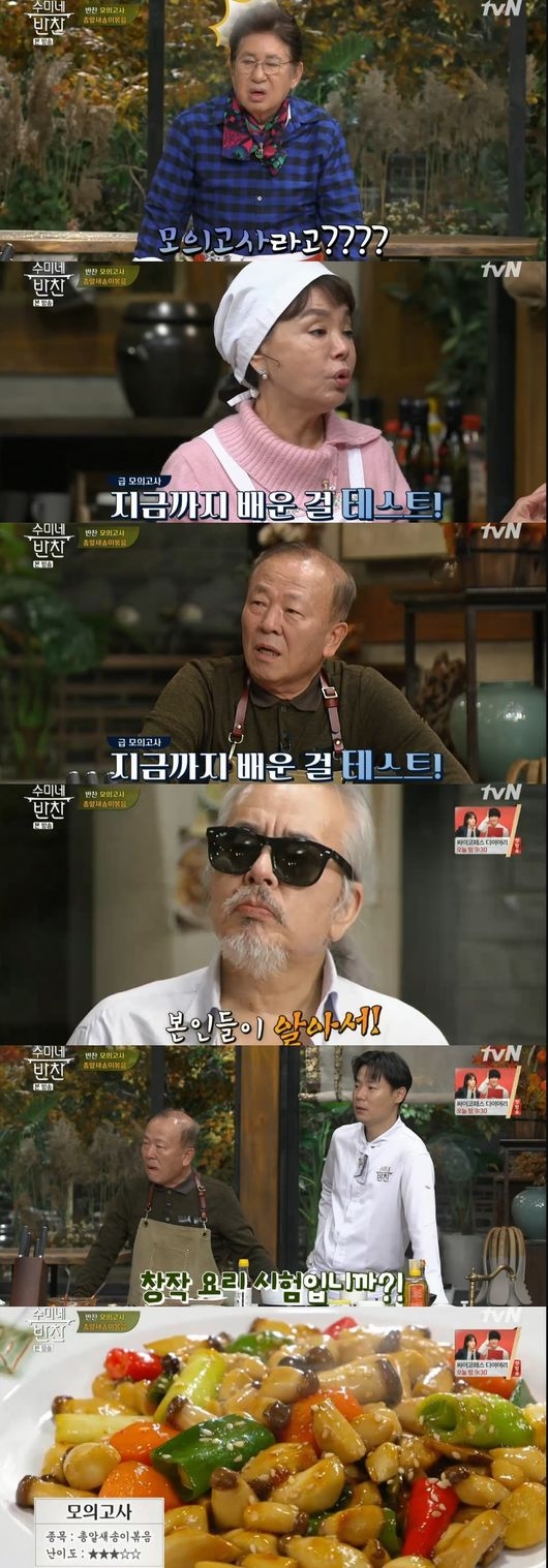 김수미는 "지금까지 배운 걸로 테스트, 본인들이 알아서 한 번 요리를 해봐라"며 급 모의고사를 제안했다.