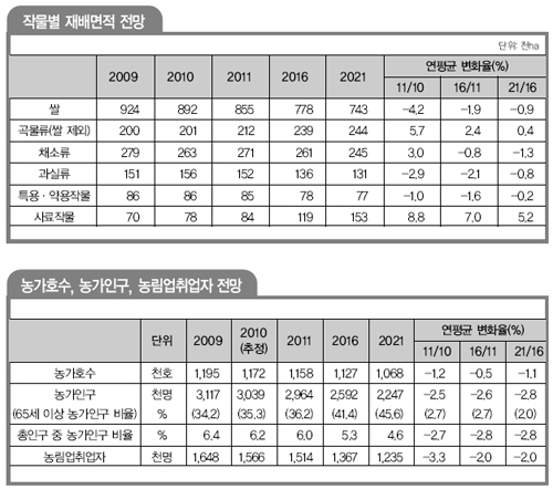 | 2011년 농가인구는 지난해보다 2.5% 줄어든 296만4000명에 이를 전망이다. 이와 함께 농가 호수도 1.2% 줄어든 115만8000호, 경지면적은 0.8% 줄어 170만1000ha로 예상된다. 한국농촌경제연구원(원장 오세익)은 구제역으로 취소된 ‘농업전망 2011’의 관련 정보를 홈페이지를 통해 이같이 발표했다. 농경연의 ‘농업전망 2011’에 따르면 농가인구는 지난해 303만9000명에서 296만4000명으로 줄어들었으며 농가호수도 117만2000호에서 115만8000호로 낮아질 것으로 전망됐다. 이에 따라 총인구 중 농가인구 비율은 6.0%를 기록할 것으로 보인다. 이와 함께 경지면적도 171만5000ha에서 170만1000ha로 떨어질 것으로 추정됐다. 농가호당 경지면적은 0.4% 늘어 1.47ha가 될 것으로 조사됐으며 농가인구당 경지면적도 1.7% 높아져 57.4a로 예상됐다. 또 쌀 재배면적은 89만2000ha에서 4.2% 낮아져 85만5000ha로 예상됐으며 과실류도 사과, 복숭아의 면적은 증가한 반면 배, 감귤, 단감 등의 면적이 감소해 15만6000ha에서 15만2000ha로 2.9% 줄어들 것으로 예측됐다. 약용작물은 1% 떨어진 8만5000ha로 전망됐다. 반면 쌀을 제외한 곡물류는 21만2000ha로 5.7% 증가할 것으로 전망됐으며 채소류는 마늘, 족파, 대파, 배추 등의 면적 증가로 3% 늘어난 27만1000ha로 추정했다. 또 사료작물은 8만4000ha로 8.8% 늘어날 것으로 전망됐다. 호당 농가소득은 3420만원으로 전년보다 0.9% 증가할 전망이다. 농외소득이 지난해보다 6.8% 증가한 1403만원으로 나타났으며 순수하게 농업활동으로 이뤄진 농업소득은 1065만원으로 6.4% 감소할 것으로 예상됐다. 쌀 생산액 5.9% ↑, 자급률 94.9% 이에 반해 농업부문 생산액은 총 44조9880억원으로 전년보다 2.9% 증가할 것으로 전망됐다. 이 중 재배업은 지난해보다 3.1% 증가한 26조6430억원으로 조사됐으며 축산업이 2.6%증가할 것으로 추정됐다. 쌀 생산액은 생산량 및 가격 회복으로 전년대비 5.9% 증가한 7조5420억원으로 전망됐다. 연평균 쌀 가격도 80㎏당 14만4000원 내외가 될 것으로 예측됐다. 또 평년단수를 적용한 쌀 생산량은 426만8000톤, 자급률은 94.9%가 될 것으로 추정됐다. 이와 함께 과실류도 7% 생산액이 증가해 4조480억원으로 전망됐다. 채소류의 경우 봄배추, 양배추, 양파 등은 증가하고 무, 당근, 마늘, 고추 등은 감소해 전년대비 2.2% 감소한 9조3410억원에 이를 것으로 예상됐다. |
