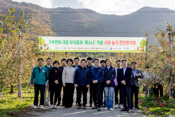 글로벌아그로㈜(대표이사 이용진)는 미생물제 ‘메소나’가 기후변화 대응형 생육 개선 효과를 입증했다고 밝혔다. 이번 시험은 국립농업과학원과 글로벌아그로(주)가 공동 수행한 산업체 협력연구의 일환으로, 경북 영천시 자양면 사과농가에서 진행됐다. 농촌진흥청 이승돈 청장도 이날 현장을 직접 방문해 메소나 적용 포장의 생육 및 수확 현황을 점검하여 기술 성과를 확인했다