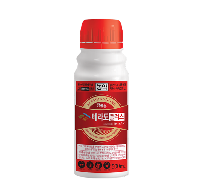 ‘테라도플러스’는 팜한농이 세계 최초로 개발한 신물질 비선택성 제초제 ‘테라도’를 함유한 제초제다. 접촉형 성분과 이행형 성분의 합제로, 제초효과가 빠르고 4주 이상 잡초 재생을 억제한다. 약제 처리 후 단 하루 만에 강력한 제초효과를 확인할 수 있을 만큼 빠른 제초효과를 자랑한다. 난방제 잡초인 깨풀, 쇠비름, 가막사리, 닭의장풀, 망초, 토끼풀, 환삼덩굴, 박주가리 등에 약효가 우수하며, 피, 바랭이 등 화반과 잡초에도 효과적이다.