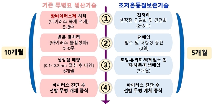 ▲기존 무병묘 생산기술과 초저온동결보존기술의 단계별 소요 시간