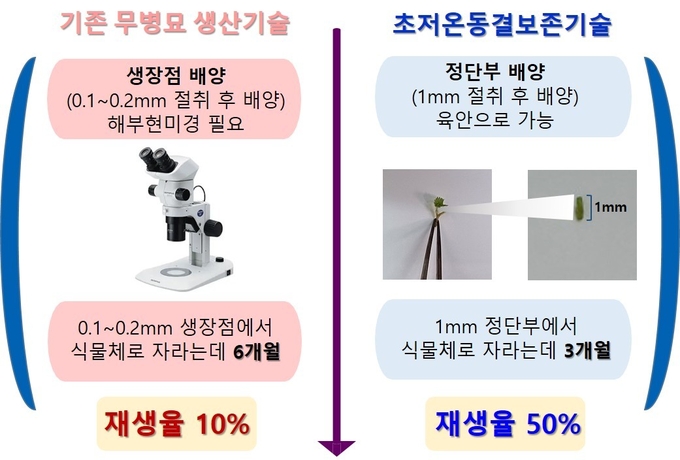 연구진은 초저온에 들어가기 전, 식물세포가 죽지 않도록 적합한 농도와 시간으로 동결 보존제를 처리하는 전처리를 진행했다. 이렇게 생산한 무병묘 생산율(재생률)은 50%로, 항바이러스제와 열처리를 활용한 기존 무병묘 생산율 10%보다 높게 나타났다. 생산 시간도 전처리, 생장점 배양 과정이 줄며 기존의 절반인 5개월까지 단축했다.