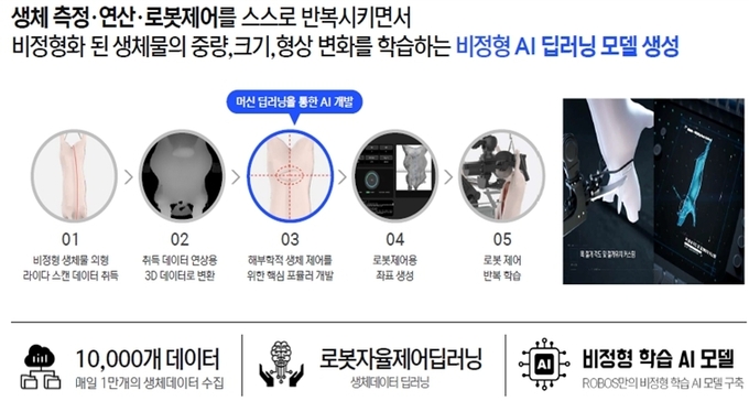㈜로보스는 돼지마다 다른 체형과 장기 위치를 실시간으로 파악할 수 있는 지능형 인공지능 학습 기술을 활용해 내장 적출 로봇 시제품(프로토타입)을 개발하고 있다.