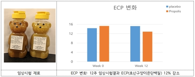 농촌진흥청은 아동‧성인 66명을 대상으로 12주간 인체적용시험을 했다. 두 집단으로 나눠 프로폴리스 추출물, 위약을 2.5ml씩 12주간 섭취시킨 결과, 프로폴리스 추출물 섭취군에서 면역 과민 반응을 유발하는 인터루킨-4와 13의 mRNA 발현이 50% 감소했다.