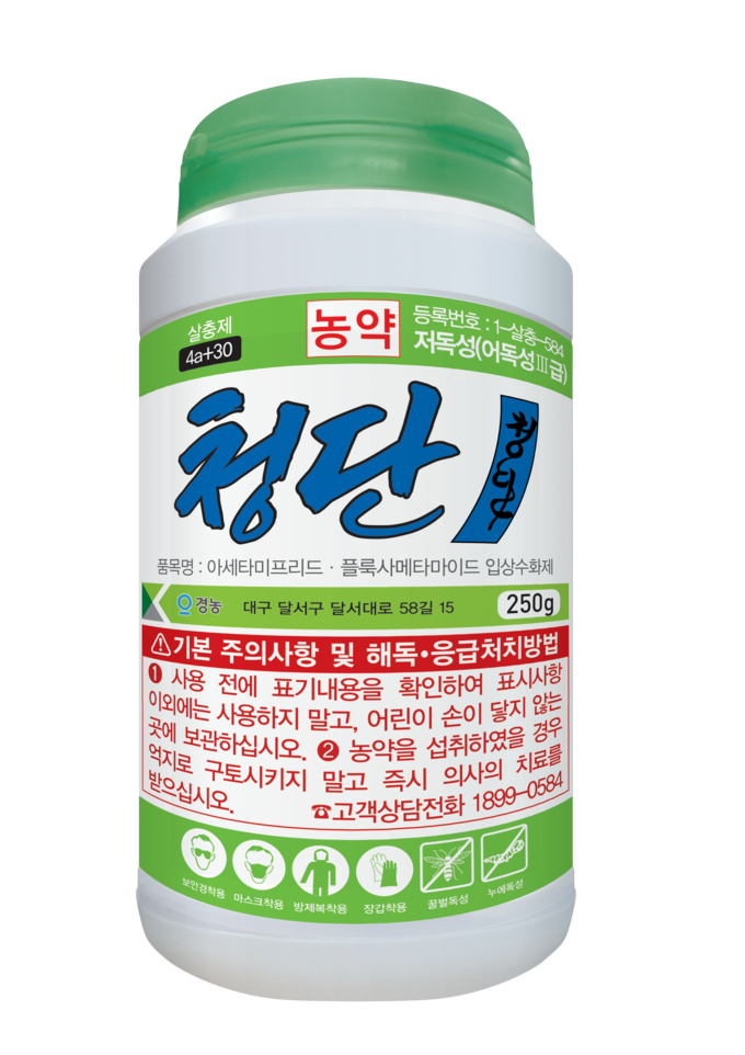 청단 입상수화제는 아세타미프리드와 플룩사메타마이드를 결합한 과수용 종합살충제로, 흡즙해충은 물론 나방·노린재·총채벌레·돌발해충까지 폭넓게 방제한다. 침투이행성이 뛰어나 약효 발현이 빠르면서도 잔효력이 안정적으로 유지돼 방제 공백을 최소화한다. 복합 해충 피해가 잦은 과수 재배 현장에서 다양한 해충을 동시에 관리할 수 있어 작물 보호효과가 뛰어나고 실용성이 높은 제품이다.