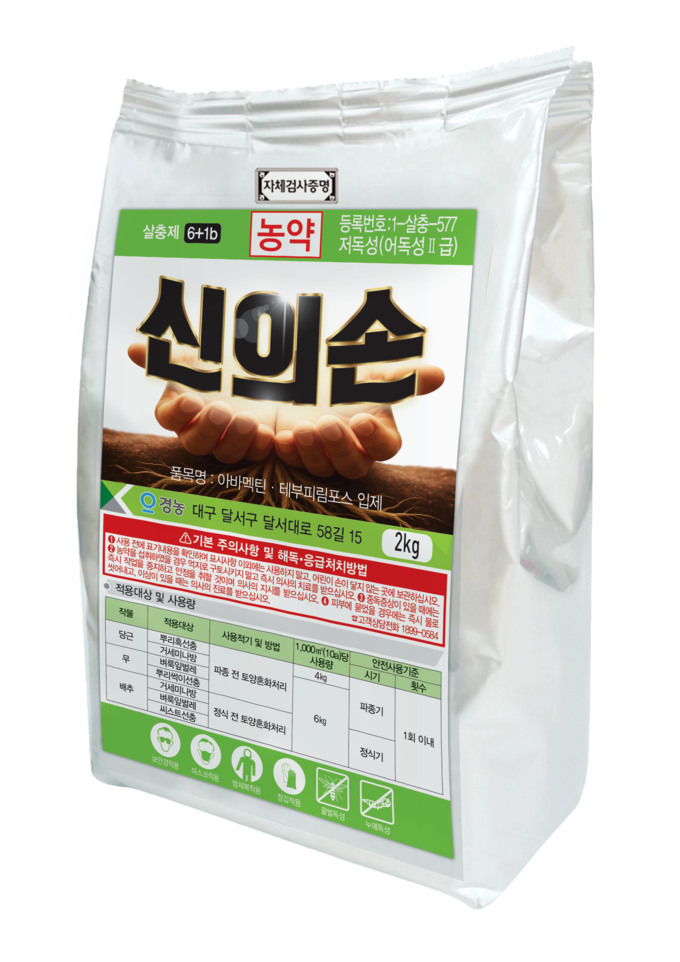신의손 입제는 멕틴계의 빠른 효과와 유기인계의 지속성을 결합한 토양처리형 살충제로, 선충과 토양해충을 동시에 방제할 수 있는 것이 가장 큰 강점이다. 뿌리에 많은 피해를 주는 씨스트선충, 뿌리혹선충, 뿌리썩이선충 뿐만 아니라 거세미나방, 벼룩잎벌레까지 효과적으로 동시방제 할 수 있다. 정식 또는 파종 전 1회 토양혼화 처리만으로 장기간 약효를 유지해, 초기 생육기부터 수확기까지 안정적인 효과를 자랑한다.