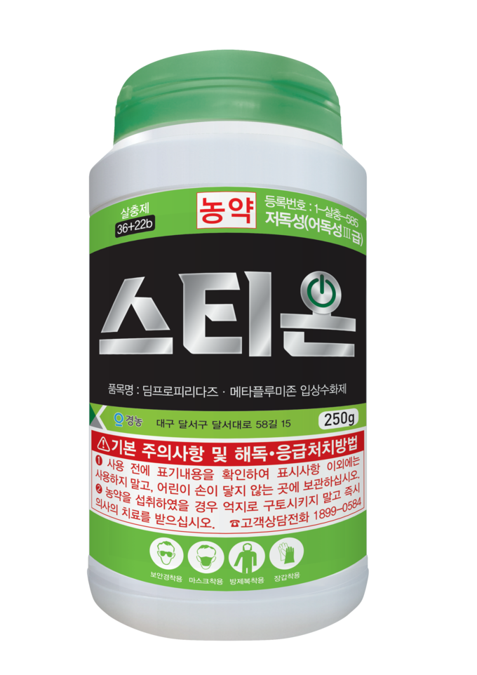 스티온 입상수화제는 신규 작용기작인 딤프로피리다즈와 세미카바존계인 메타플루미존을 결합한 2중 합제로, 해충의 현음기관과 신경계에서 작용해 빠른 효과를 자랑한다. 저항성 진딧물·가루이·나방류 등 기존 약제에 저항성이 생긴 해충에도 안정적인 방제 효과를 보이며, 개화기 꿀벌에 안전하고 약효 지속력이 우수한 고기능성 살충제다. 작물의 전 생육기 사용이 가능해 연속 수확 작물과 과수 재배 현장에서 활용도가 높은 제품이다.