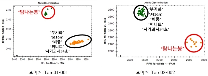 연구진은 ‘부지화’와 ‘탐나는봉’ 유전체를 전체 유전체 정보 분석법(WGS)을 통해 해독했다. 그 결과, 2번 염색체 염기(SNP*)와 7번 염색체 염기에서 두 품종의 유전적 차이를 확인할 수 있는 염기서열을 찾았다. 이어, 이 염기서열을 이용해 종을 식별할 수 있는 유전자 표지(KASP)를 만들었다.